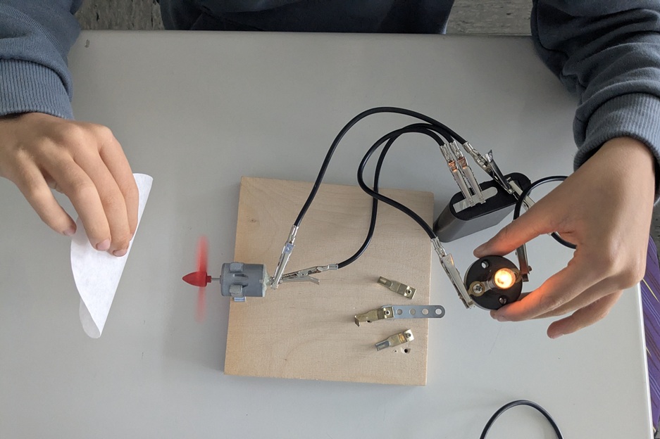 Und das taten wir dann auch: Mit den Kabeln, der Batterie und der Glühbirne bauten wir einen Stromkreis und haben dadurch die Glühbirne zum Leuchten gebracht. Ein bisschen mussten wir ausprobieren, bis es dann funktioniert hat – und wir saßen nicht mehr im Dunkeln.