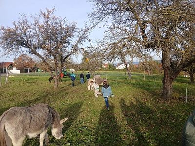 Jeden Mittwochnachmittag von 14 – 15.30 Uhr trifft sich die GartenAG. Im Frühjahr und Sommer pflanzen wir Gemüse an, mähen den Rasen, ernten, kochen und haben Spaß miteinander. Im Spätherbst und im Winter gehen wir in den Wald, kochen, basteln, schnitzen Kürbisse oder machen Ausflüge, wie z. B. vor kurzem zur Eselfarm.